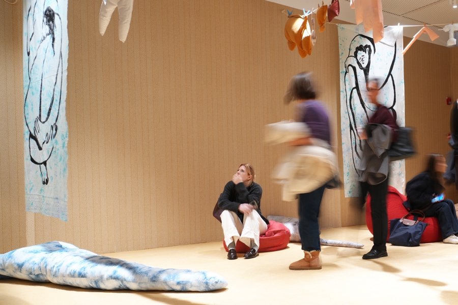 “社会” 单元敏锐捕捉日常中的压力、焦虑与幽默:克鲁布・加洛普《04:23》《是什么让我们疲惫不堪》等作品,以黑白图像、蜡染等技法将现代生活隐性压力与疲惫感具象化,并用幽默笔触勾勒时代情绪的复杂性。