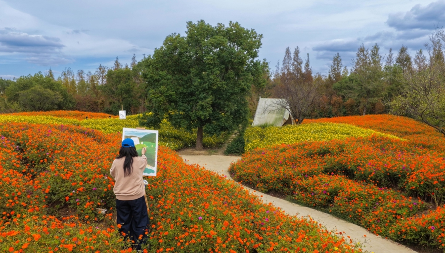 地肤的红色浪漫并非孤景。园区内,象征幸福的格桑花沿小径烂漫盛开,金橙色的硫华菊与缤纷的百日菊也正值盛放,与地肤草浪相映成趣,共同摇曳出秋日的韵律。